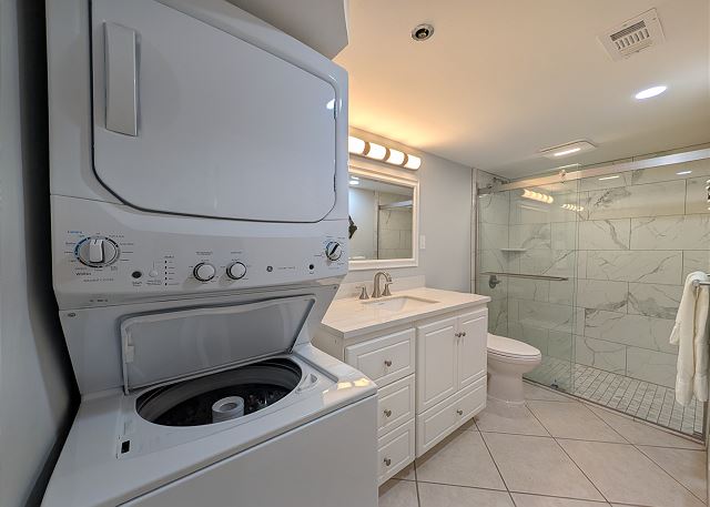 Bedrooms: Retreat to the tranquil master bedroom featuring new king-size bed and a 32" TV for your entertainment. The master bathroom has been recently remodeled with a walk-in shower and features a double sink vanity and contemporary mirrors. The guest bedroom is thoughtfully furnished with both a twin-sized bed and a full-size bed, along with a 32” TV, ensuring everyone has a comfortable space to unwind. The guest bathroom also showcases modern updates, including a new vanity and countertops.