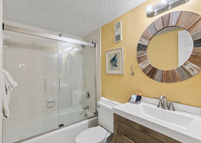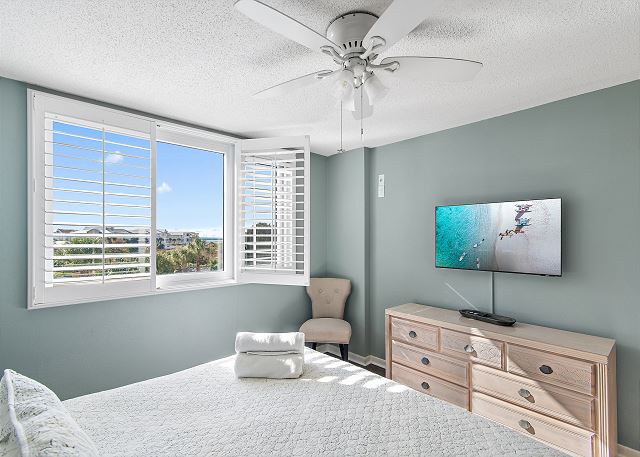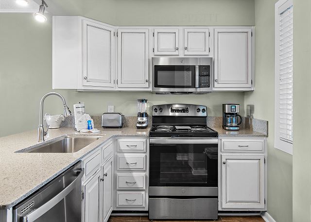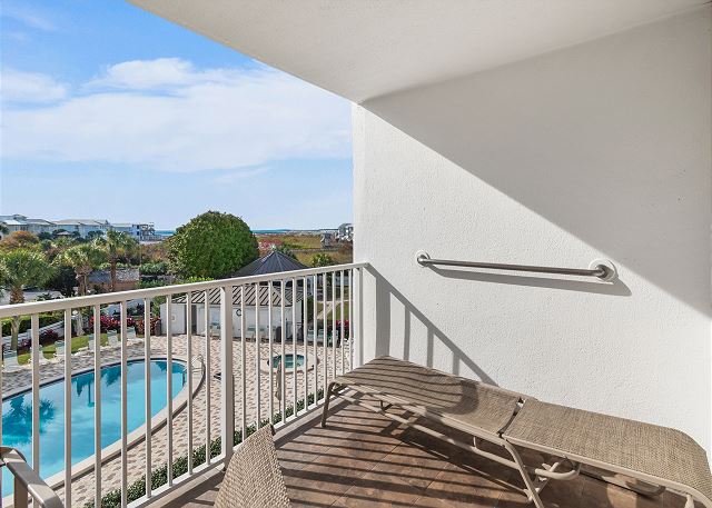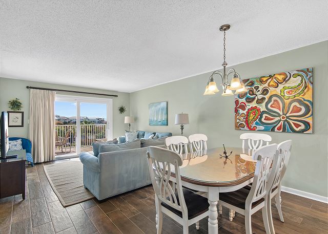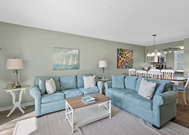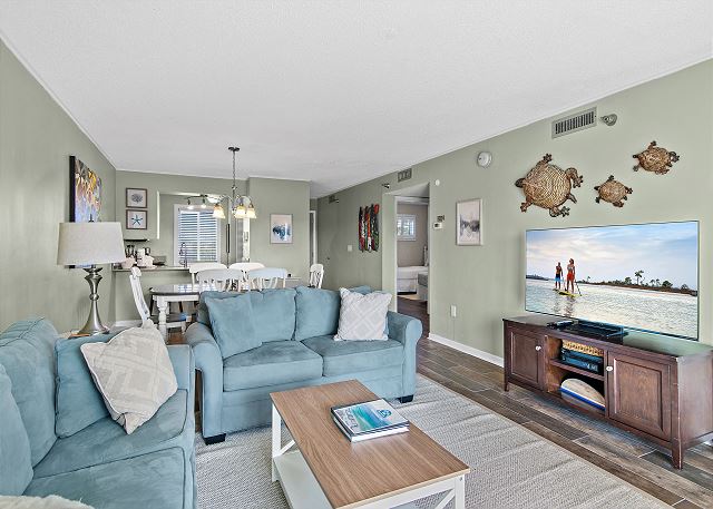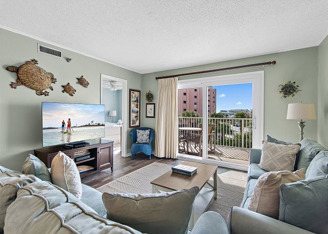 Living Area: Unwind in the cozy living area, furnished with updated pieces designed for comfort and relaxation. Enjoy your favorite shows and movies on the 42” TV with a DVD Player combo and digital cable access, providing entertainment options for everyone. The inviting decor creates a welcoming ambiance, making it an ideal space for family gatherings or relaxing evenings after a day spent exploring Destin. A queen sleeper sofa offers additional sleeping arrangements. Enjoy the private balcony, where you can enjoy beautiful views of the surroundings while sipping your morning coffee or unwinding with a glass of wine in the evening.