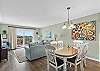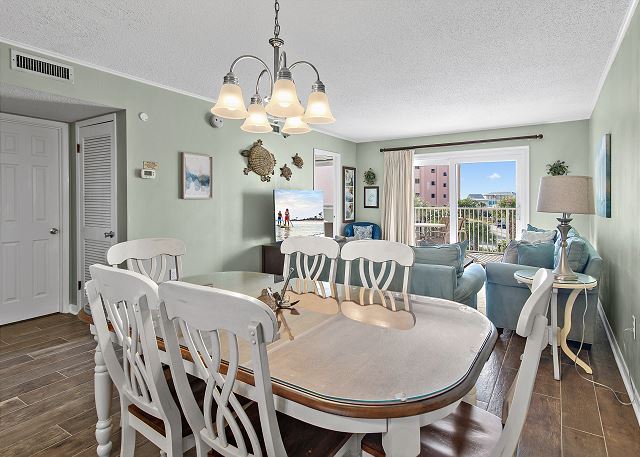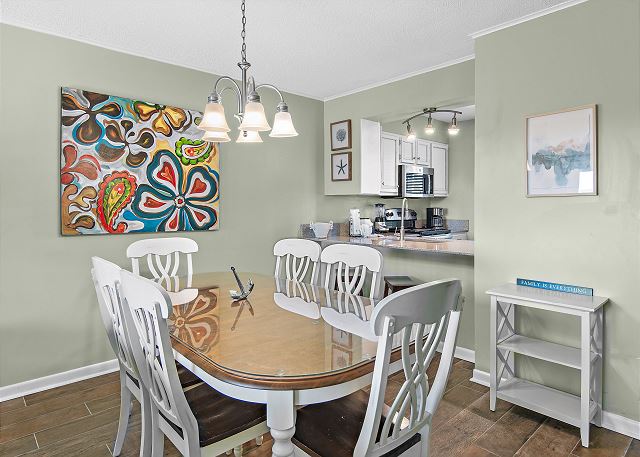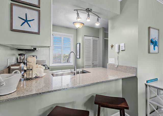 Fully Equipped Kitchen & Dining Area: Renovated featuring elegant granite countertops and new cabinets create a modern yet inviting atmosphere. All the cooking essentials, including pots, pans, utensils, and a coffee maker to start your mornings right. Gather around the spacious dining table that seats 6, making it the perfect spot for family meals, game nights, or sharing stories after a day of beach adventures.