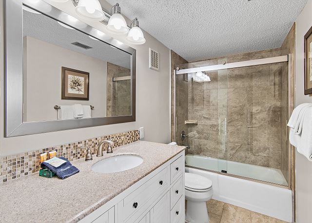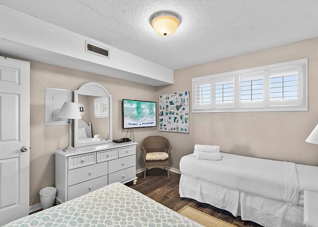 Bedrooms: The master bedroom features a luxurious king-size bed, for a restful night’s sleep. A flat screen TV with a DVD Player adds to your comfort, allowing for late-night movie marathons. The bathroom includes a new vanity with granite countertops and a convenient tub/shower combo, providing a spa-like experience. The guest bedroom is equipped with two twin-sized beds, perfect for kids or friends, along with a flatscreen TV and an iPod dock for your entertainment.