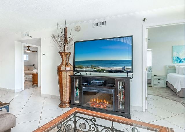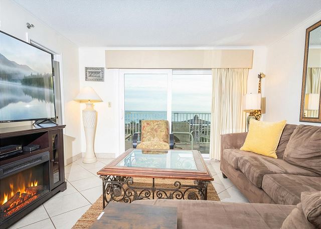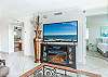 Living Room & Balcony: Relax in our large sectional sofa, perfect for unwinding after a day at the beach. The 65" flat-screen TV and cozy electric fireplace enhance the ambiance for a cozy evening in. Step out to the private balcony and relax on the balcony that features (2) chairs, (2) rockers, and lounge watching the dolphins in the water.