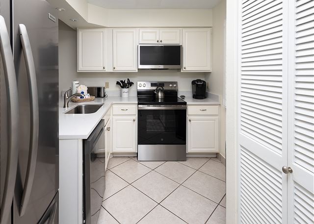 tools, everything was really clean, plenty of towels for pool and beach, appreciated that there was a staff member in the lobby for check-in and questions, pool was perfectly cleaned at all times and warm. The beach was as close as it could be. And the two comfort beach chairs and umbrella were glorious. Saw dolphins the morning I got up early-straight from our porch right in front :-) couldn’t have been happier. I just would have brought potholders if I were to change my preparations :-)